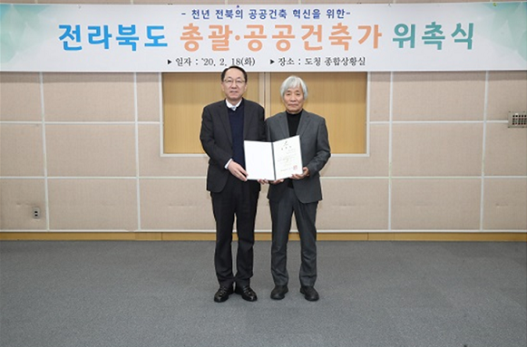 전북도는 2월 18일 도청 종합상황실에 윤충열 원광대 명예교수를 초대 총괄건축가로 위촉하고, 공공건축가로 도내외 및 건축사 20명을 위촉했다고 밝혔다. 지난해 10월 전북도의회는 공공건축가 제도도입을 위해 전라북도 건축 기본 조례 일부개정조례안을 개정한 바 있다. 개정안은 총괄 및 공공건축가 제도의 운영방법 등을 신설하는 등 제도 시행 근거를 마련하는 내용이다. 전북도 역시 개정된 조례에 맞춰 세부시행계획을 수립 하는 등 그동안 사전준비를 꾸준히 진행해왔고, 이날 위촉식을 시작으로 본격적인 공공건축가 제도 시행에 나선 것이다.