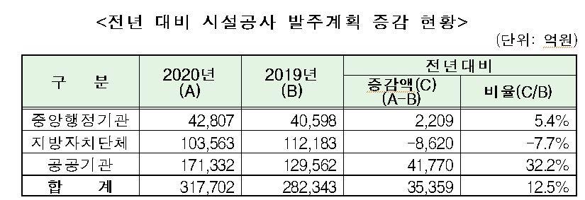 조달청의 올해 공공공사 규모는 31조7,000억 원에 달할 것으로 나타났다. 조달청은 2월 24일 중앙행정기관, 지방자치단체, 공공기관 등에서 발주할 2020년 공공부문 시설공사 발주계획을 발표했다. 올해 시설공사 집행규모는 지난해 28조2,000억 원보다 12.5%인 3조5,000억원 증가한 31조7,000억 원이다. 중앙조달 8조5,000억 원을 조달청이 직접 발주하고, 이외 23조2,000억 원은 지방자치단체와 공공기관이 개별 시스템과 나라장터를 통해 자체 발주할 예정이다. 특히 경제활성화 지원을 위해 총 발주금액의 67%에 해당하는 21조2,392억 원을 상반기에 발주할 계획이다.