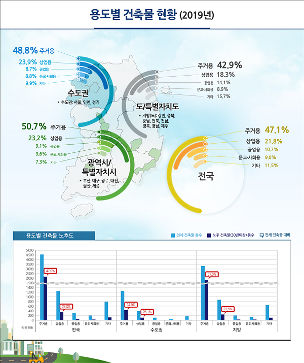사용승인 후 30년 이상 된 건축물은 273만8,500동으로 전체의 37.8%를 차지했다. 연면적은 6억7,229만9,000제곱미터로 전체의 15.7%로 나타났다. 노후 된 건축물의 용도는 수도권과 지방을 가리지 않고 모두 주거용이 가장 많은 것으로 나타났고, 멸실된 건축물의 동수는 전년대비 4.8% 증가한 7만3,653동, 연면적은 6.7% 증가한 1,623만1,000제곱미터이다. 30년 이상 노후 된 건축물 비율이 가장 높은 지역은 42.4%를 기록한 대구 서구로 나타났다.