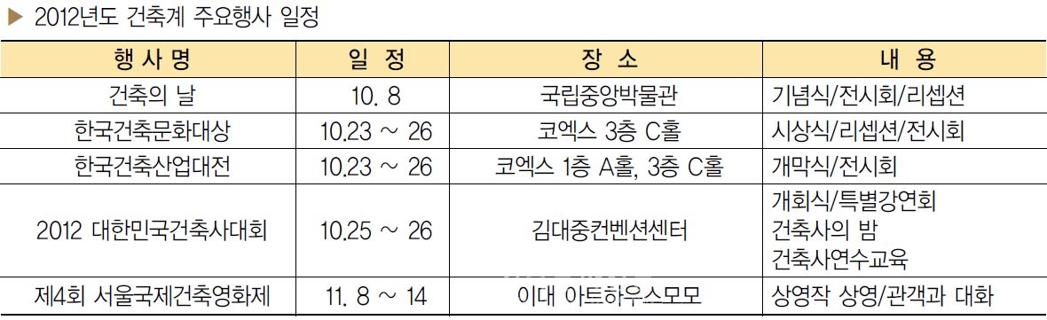 올 해 개최될 건축 행사는 10월 8일 ‘건축의 날’ 기념식을 시작으로 10월 23일부터 26일까지 ‘한국건축문화대상’, ‘한국건축산업대전’이 열리며, 10월 25일부터 26일 양일간 ‘2012 대한민국건축사대회’가 열린다. 이후 11월 8일에는 일주일간 ‘제4회 서울국제건축영화제’가 개최된다. 이와 함께 전국 각 시도건축사회도 지역별로 건축문화제, 건축대전, 체육대회 등 다양한 행사를 준비 중이다.