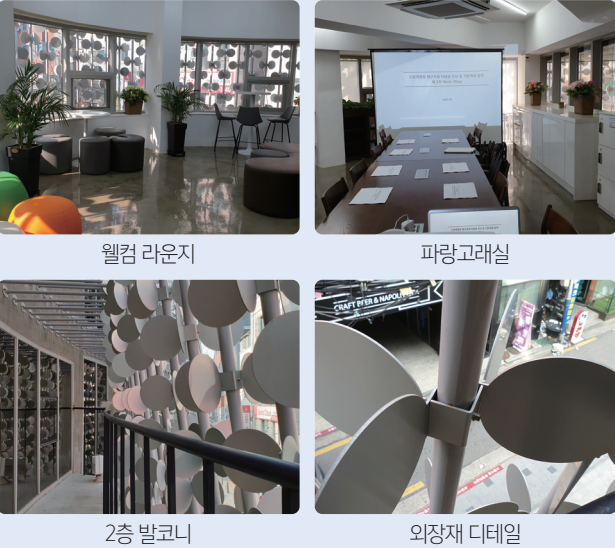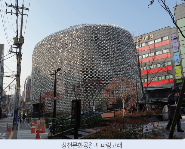 그러한 가운데 문화 생태 플랫폼이라는 주제로 마련된 커뮤니티 공간 파랑고래는 색다르다. 젊은이들이 많이 모이는 장소에 공원과 함께 조성돼 있어 새로운 커뮤니티 공간으로 주목받고 있다. 이러한 공간들이 사람들이 쉽게 이용할 수 있게 주변에 속속 들어서고 있어 보기 좋다.
