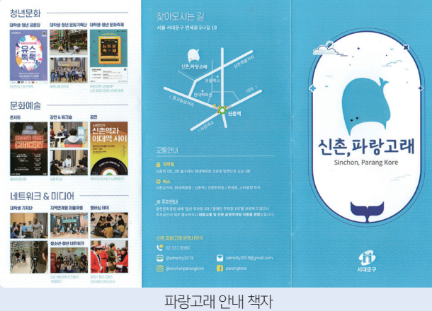 ‘신촌, 파랑고래’의 명칭은 청춘을 상징하는 푸른색(靑)과 고래를 형상화한 건물 외관에서 유래한 것이다. 청년 문화를 상징하는 신촌 지역에 새워진 도시재생 앵커시설로, 대학생, 청년, 지역주민이 함께 문화적 삶의 가치를 창출하기 위해 만들어졌다.