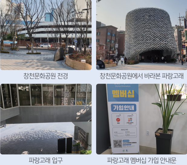 신촌역 1번 출구에서 백화점을 돌아 골목으로 들어가면 푸른 광장이 보인다. 창천문화공원이다. 공원과 함께 작은 동상들과 가수 김현식의 동상, 노랫말이 보인다. 이를 배경으로 색다른 디자인의 매스가 보인다. 러시아에서 볼 수 있을 법한 모자가 연상되기도 하고, 영국 왕실의 근위병 모자 같기도 한 건축물이 시선을 끈다. 공원 외곽에 입지해 주변 건물들과 다른 독특한 건축물인 파랑고래다. 파랑고래는 2019년 5월 29일 오픈했다. 신촌 지역의 문화예술 활성화를 위한 문화예술 활동가의 아지트라고 표현할 법한 공간이다. 서대문구 연세로5나길 19번에 위치한 창천문화공원 내 작은 모퉁이에 설치된 파랑고래는 주중에는 9시부터 21시까지, 토요일에는 9시부터 18시까지 운영을 한다. 일요일과 법정공휴일은 휴관한다.