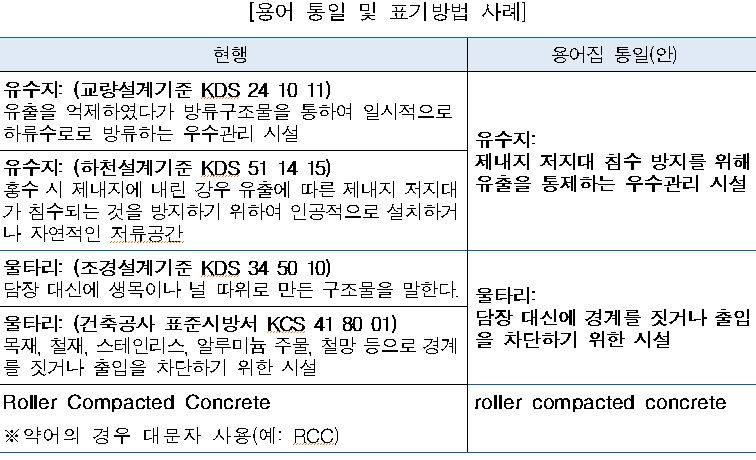 한편, 용어집은 관계기관과 단체에 배포할 예정이고, 국가건설기준센터(www.kcsc.re.kr)을 통해 쉽게 활용할 수 있다.
