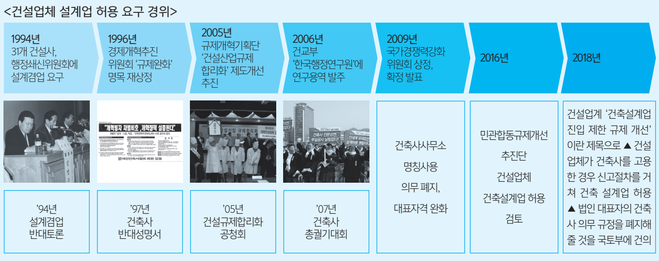 설계·시공겸업 문제는 비단 어제 오늘의 문제는 아니다. 시간을 거슬러 올라가 지난 1997년 규제개혁, 또 2005년 국무조정실 주관 규제개혁 장관회의에서 ‘건설업계가 건축 설계업에 참여하는 것’을 건설 산업의 경쟁력 제고를 위한 규제합리화 방안 중 하나로 추진키로 하는 등의 요구가 있었다.