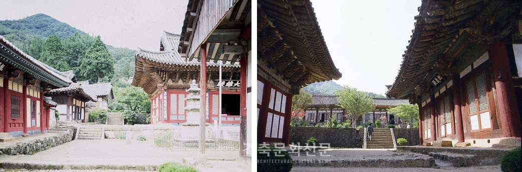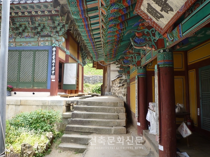 고려 때는 탑돌이를 할 때나 집돌이(요잡 繞匝)를 할 때도, 모두 시계 방향으로 돌았다. 그런데 갑자기 반대 방향으로 돌아야 하니, 절집 의례에서 혼란이 올 수밖에 없었다. 서산 개심사를 보자. 집 앞 밖에 가로로 기다랗게 영지(그림자 못 - 자신의 업을 드려다 보는 거울)를 두고 서남쪽에서 들어간다. 고려 때 같으면(개심사는 백제 때 이미 계획된다) 서남쪽에 대문을 둬도 되지만, 동남쪽으로 대문을 내기 위해는 누마루를 낮게 만들고 그 옆에 조그만 대문을 만들어서 그쪽으로 유도하고 있다. 사람들은 괜히 바깥마당을 가로질러 들어가지 않으면 안 된다. 절집에서 이렇게 작은 사주문을 별도로 두는 경우는 매우 드물다. 또한 중문을 들어선 신도가 대웅전 동문으로 들게 하기 위해서는, 대웅전 집굽(기단) 가운데 디딤돌(계단)을 없애 버리고, 마당 왼 켠 요사채를 따라 들어가면 그 뒷채가 동문으로 유도하도록 얼굴을 내밀어 손짓하고 있다. 처마의 서까래 모습을 보면 우리에게 어떤 암시를 하고 있는지 알 수 있다.