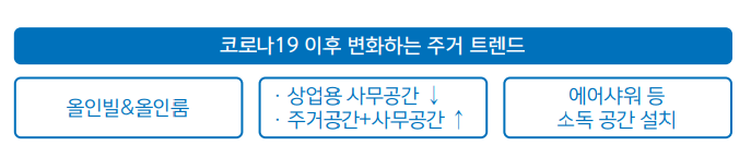 전 미국 국무장관 헨리 키신저는 “코로나19 펜데믹(대유행)이 끝나도 세계는 그 이전과 전혀 같지 않을 것”이라며 코로나19가 가져올 일상의 변화를 예고했다. 실제 코로나19 사태로 재택근무를 시행하는 회사들이 늘어나면서 거주자들이 집에 머무는 시간이 크게 증가했다. 마침 집에서도 직장업무와 쇼핑, 온라인 수업 등을 무리 없이 진행할 수 있게 되면서 다양한 산업군들도 빠르게 변화를 꾀하고 있다. 바야흐로 ‘올인빌(all in Vill)’, ‘올인룸(all in Room)’의 시대가 시작된 것이다.