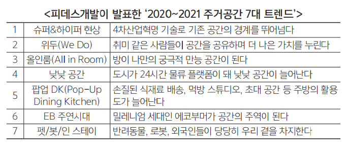 ‘올인빌’과 ‘올인룸’은 ‘집 또는 방 한 칸에 모든 것을 갖추고 있음’을 뜻한다. 피데스개발은 코로나 사태 이전인 지난해 말 ‘2020~2021 주거공간 7대 트렌드’를 통해서 올인룸 시대를 예측한 바 있다. 이런 현상이 빠르게 현실화될 수 있었던 바탕에는 탄탄하게 준비된 4차산업기술력이 있었다. 지난해 12월 4일 열린 주거공간 트렌드 발표회에서 김희정 피데스개발 R&D센터 소장은 “AI 등 4차 산업기술로 기존 공간의 용도·기능·분류가 무의미질 것”이라 전망했다.