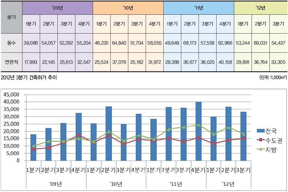 2012년 3분기 건축허가면적은 2011년 3분기보다 7.6퍼센트 감소한 33,305천m², 54,437동으로 나타났다.