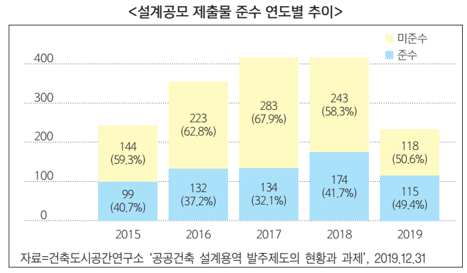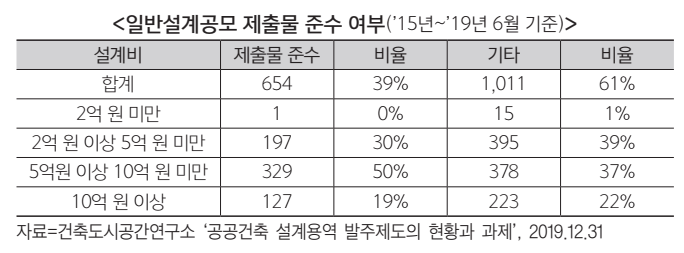 auri의 보고서에 의하면, 지침에 따라 설계공모 제출물을 설계도면과 설계설명서로 한정하거나 이를 합쳐서 하나의 적정수준에 제출물을 요구한 사업은 전체의 24%로 나타났으며 나머지 76%는 이를 제대로 준수하지 않은 것으로 알려졌다(’15년~’19년 6월 기준). 사업 규모로 나누어보면 5~10억 원 사이 사업의 준수비율이 상대적으로 높고, 2~5억 원 미만의 사업이나 10원 이상의 사업은 적정제출물보다 과다하게 요구하고 있다. 미준수 사유의 과반 이상은 설계도판이 추가된 경우였다. 그 외에 설계도면과 도판, 또는 설계설명서와 도판, 설계도면 및 도판, 모형 등의 경우가 있었다. 연도별 추이로 봤을 때 건축 설계공모 제출물 준수 비율이 점차적으로 증가하고 있다고는 하나, 소규모 건축사사무소의 부담은 여전하다.