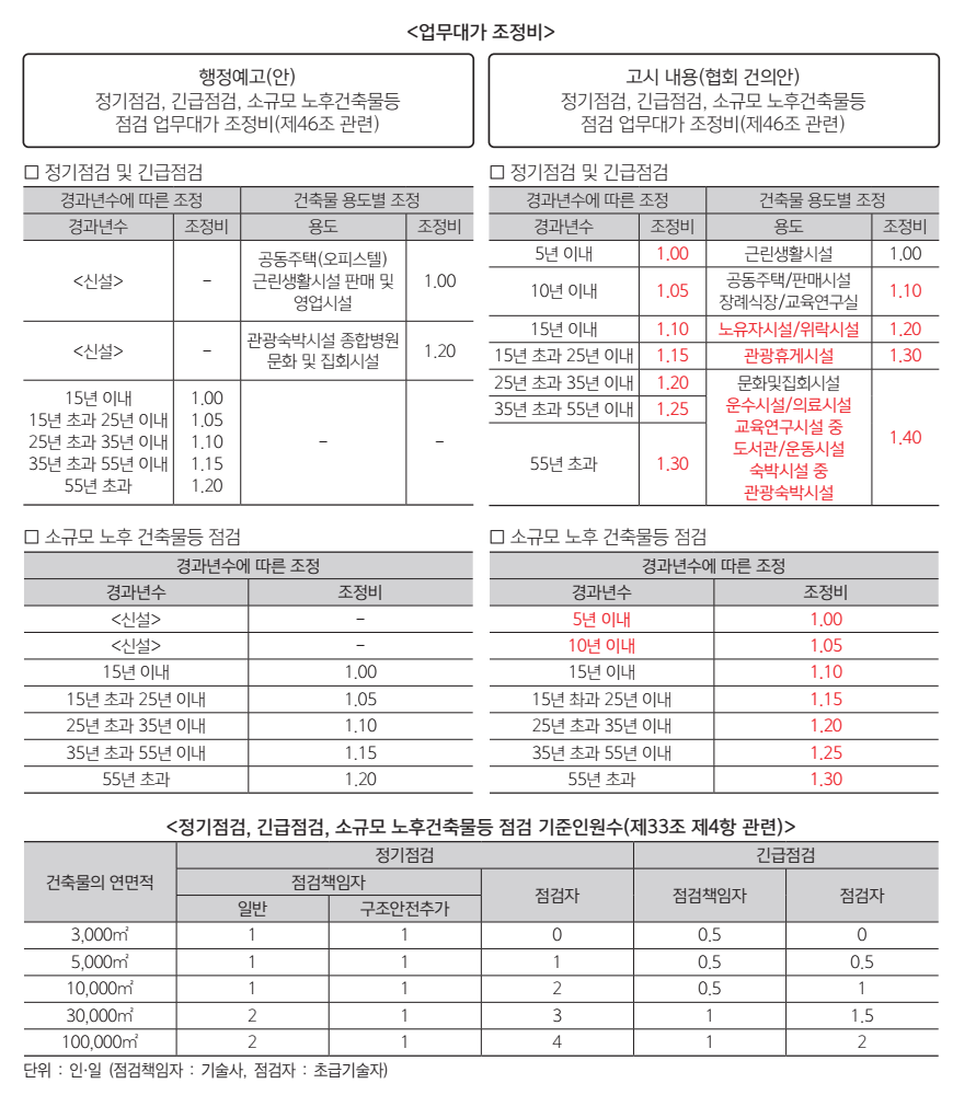 업무대가의 경우 정기점검, 긴급점검, 소규모 노후건축물 등 점거 업무대가는 각 점검업무를 수행하는 데 필요한 직접인건비, 제경비, 기술료, 직접경비와 선택과업비를 합산해 산정하게 된다.